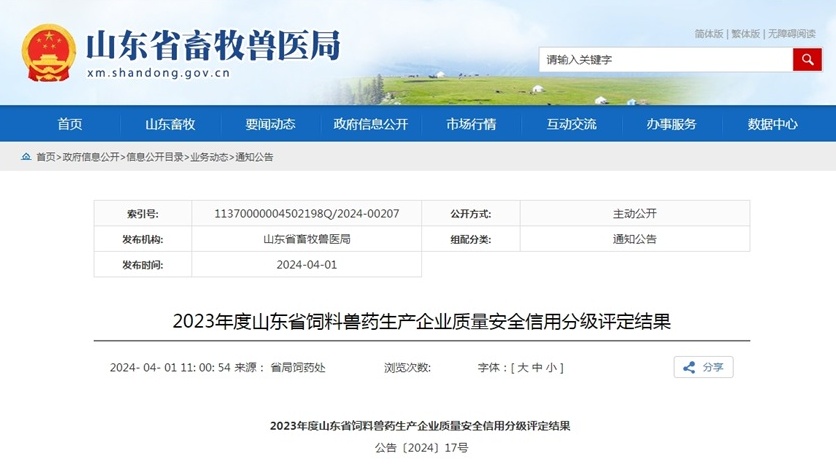 近日,山東省畜牧獸醫局發布公告,公布了2023年度飼料獸藥生產企業質量安全信用分級評定結…